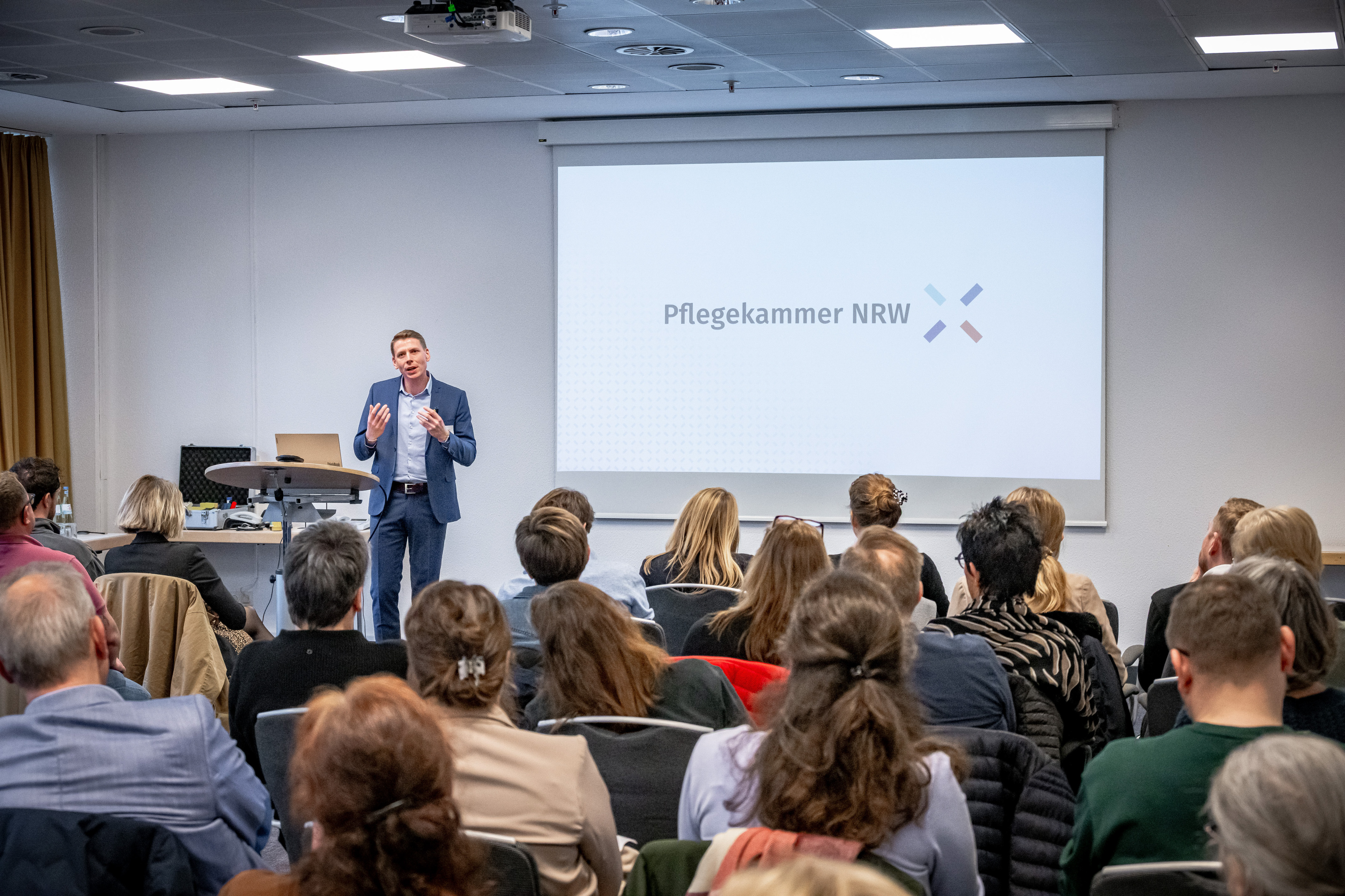 Anschließend stellte Kevin Galuszka von der Pflegekammer NRW aktuelle Zahlen zur Versorgungslage vor und machte damit die wachsende Lücke zwischen Bedarf und verfügbaren Kapazitäten sichtbar. Das nötige Fachpersonal geht zunehmend in Rente und wird teils selbst pflegebedürftig, während neue Pflegefachpersonen nicht in ausreichender Zahl nachrücken.